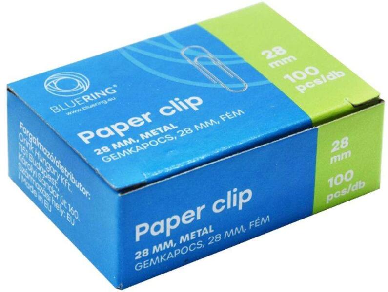 Bluering® 28 mm-es fém gemkapocs - 100 db/doboz ? Praktikus és strapabíró fém gemkapocs, ideális irodai és otthoni használatra. A Bluering® minőséget garantálja a tartósság és a megbízható működés. Jellemzők:Méret: 28 mm Mennyiség: 100 db/doboz Anyag: Nikkellel bevont fém Kialakítás: Lekerekített végű, hogy elkerülje a papír sérülését Kiszerelés: 100 db-os dobozokban kapható, nagyobb mennyiségben is rendelhető (10 és 50 dobozos kiszerelésekben) Előnyök:Erős és tartós: A nikkelezett fém kiváló minőséget és hosszú élettartamot biztosít. Praktikus: Ideális dokumentumok, papírok összefogásához. Kényelmes használat: A lekerekített végek megakadályozzák a papír sérülését. Gazdaságos: Nagy mennyiségben is kedvező árú. Alkalmazás: Irodai munka, otthoni használat, iskolai feladatok, dokumentumok rendezése.